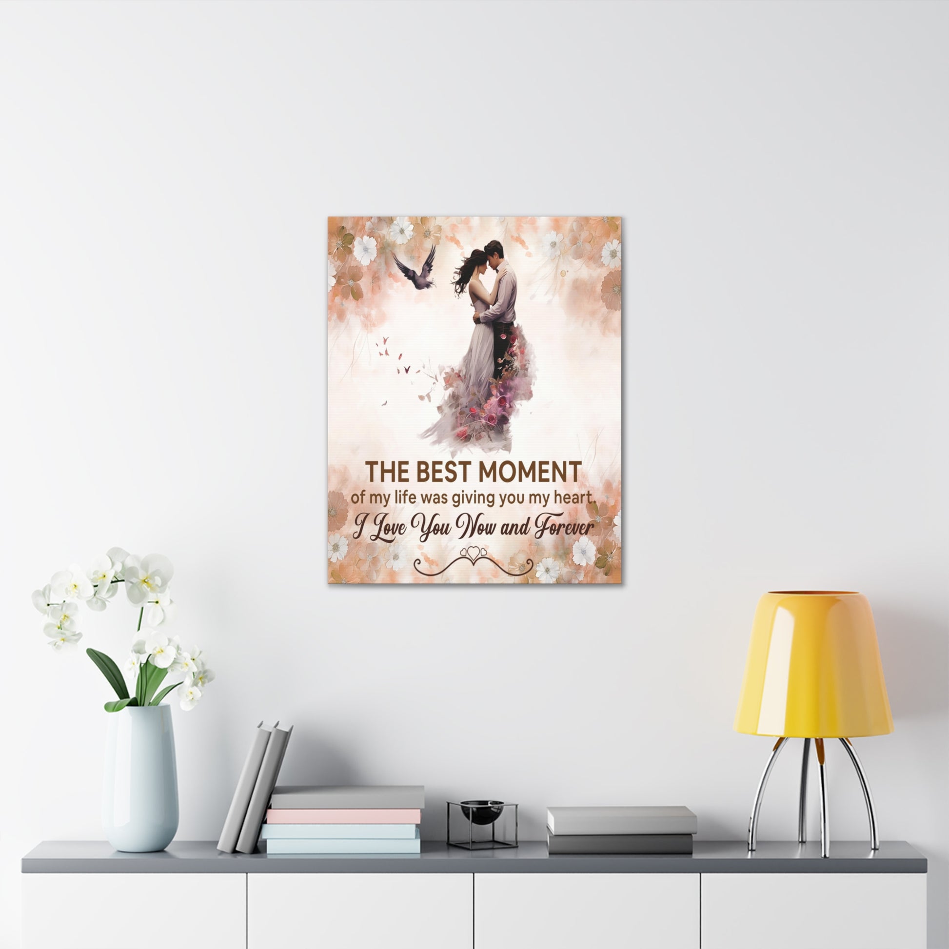 Capture the beauty of a moment frozen in time with the "Best Moment of My Life" canvas wall art. This stunning piece features a romantic illustration of a couple enveloped in a dreamy floral background, accompanied by a heartfelt message: "The best moment of my life was giving you my heart. I love you now and forever." Perfect for anniversaries, weddings, or as a meaningful gift, this canvas adds warmth, love, and elegance to any decor, celebrating a bond that lasts a lifetime.